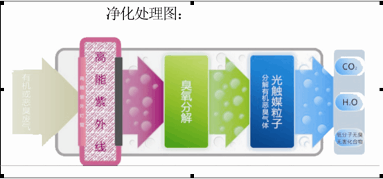 惡臭氣體利用排風(fēng)設(shè)備輸入到本凈化設(shè)備后,凈化設(shè)備運(yùn)用高能UV紫外線光束及臭氧對惡臭氣體進(jìn)行協(xié)同分解氧化反應(yīng),使惡臭氣體物質(zhì)其降解轉(zhuǎn)化成低分子化合物、水和二氧化碳,再通過排風(fēng)管道排出室外。